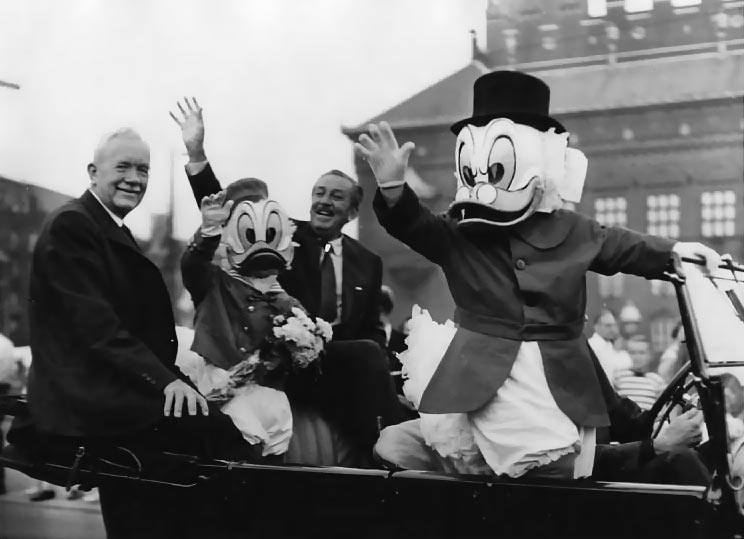 Walt Disney visited Denmark on several occasions. Left image: in 1961, he was snapped with an Aarhus Stiftstidende (a daily newspaper of Aarhus, Denmark's second largest city) on his head to ward off the rain... It was used on the front page of the little 1968 book by the Danish Film Museum called Disney, by Frederik G. Jungersen. 1000 were printed. (Click to see the image).