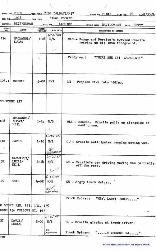 The animation staff includes John Lounsbery, Ted Berman, Blaine Gibson, Bill Keil, Fred Kopietz, Ambi Paliwoda, Milt Kahl, Hal King, Bob McCrea, Frank Thomas, Don Lusk, Julius Svendsen, Art Stevens, Bob Youngquist, Eric Cleworth and Cliff Nordberg (dogs), Marc Davis (Cruella), John Sibley and again Cliff Nordberg (Baduns), Bill Keil again (truck driver), with Dan MacManus and Dick Lucas taking care of the live-action model cars.