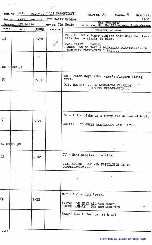 From an animation standpoint, the draft for this last sequence is a bit of a let-down, as several scenes, mainly involving dogs, had not yet been assigned--or at least not yet noted on this draft. And yet this was the one that was used for reference, in this case in the BG Morgue (which could explain it). We find Milt Kahl for most of the assigned scenes, and Cliff Nordberg animating Nanny Cook.