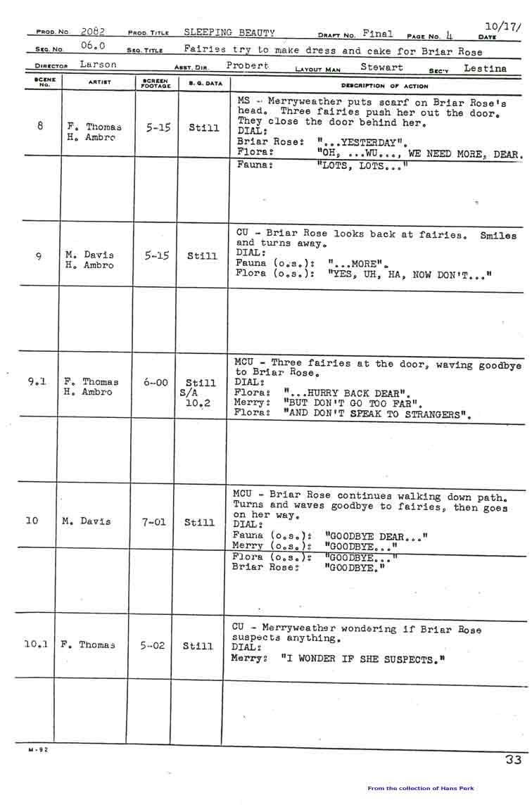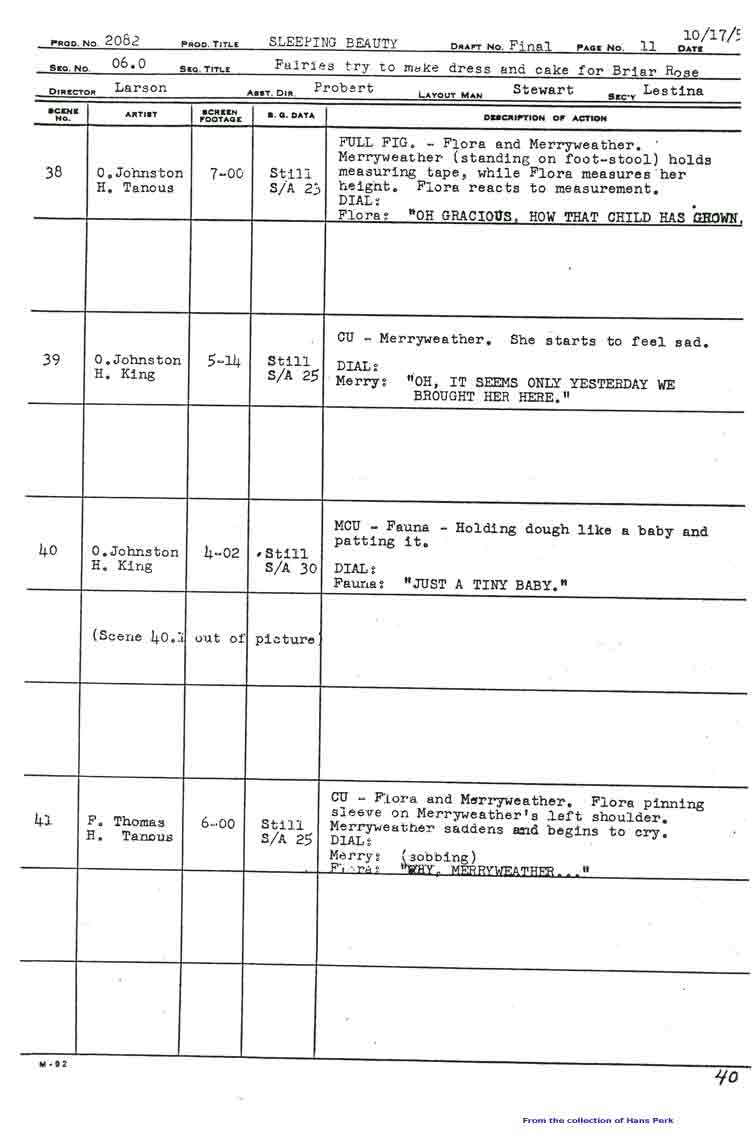 This sequence gives an interesting view of the division of the fairies scenes between Frank and Ollie. They were the supervising animators on the fairies, and I would not be surprised if they did a lot of work on the scenes before other animators like Hal Ambro, Hal King, Don Lusk, Henry Tanous or Blaine Gibson got to finish them. I suspect they posed the scenes and then handed them out to the others.