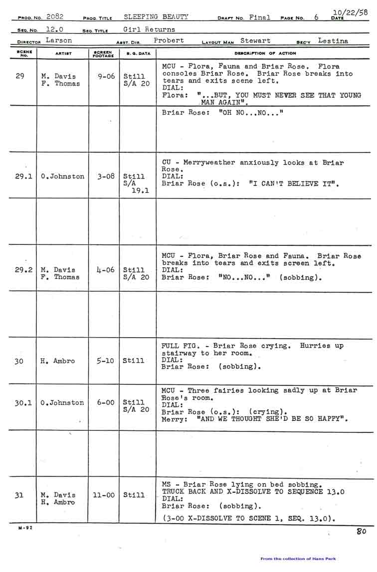 Animation by Marc Davis (Rose), Hal Ambro (Rose and Fairies), Frank Thomas, Ollie Johnston (Fairies), Jack Bailey and Blaine Gibson (Raven).