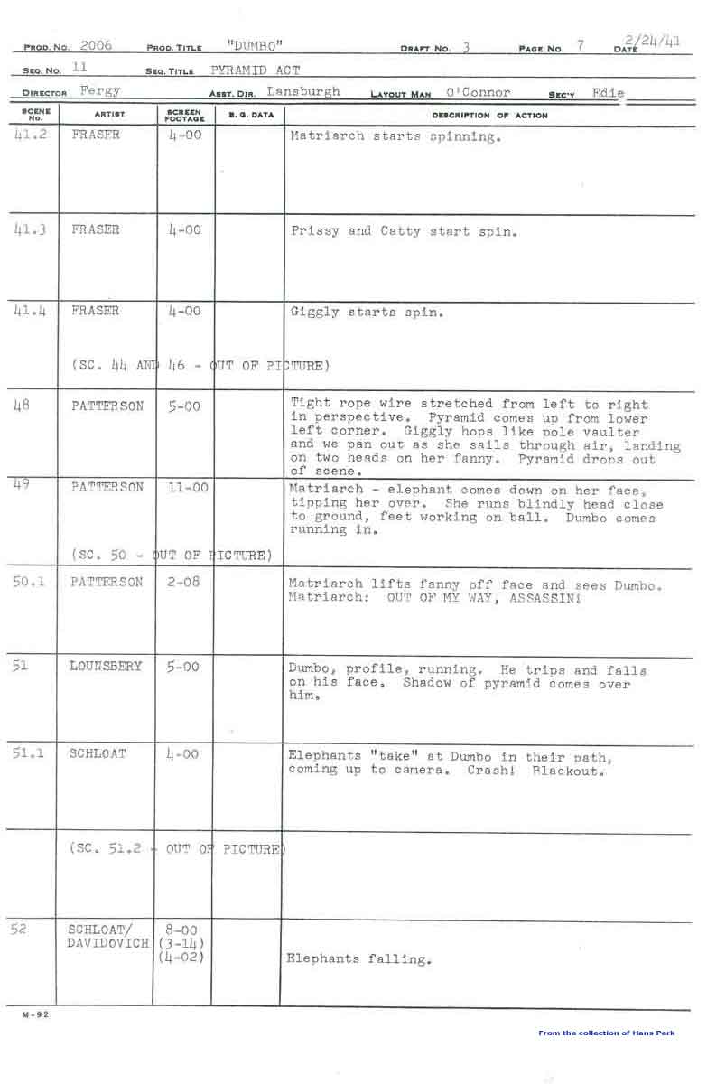 There may be another Patterson-style confusion with "Schloat" here. Notice the different spelling from the the earlier sequences (maybe down to a different typist, but maybe not). While Alberto only lists Warren Schloat as working on "Dumbo", he lists a Don Schloat as animating on te 1941 short "Pluto's Playmate", directed by... Norm Ferguson. (But, he also says Warren worked on "Pluto, [19]41", so there may be some confusion already)