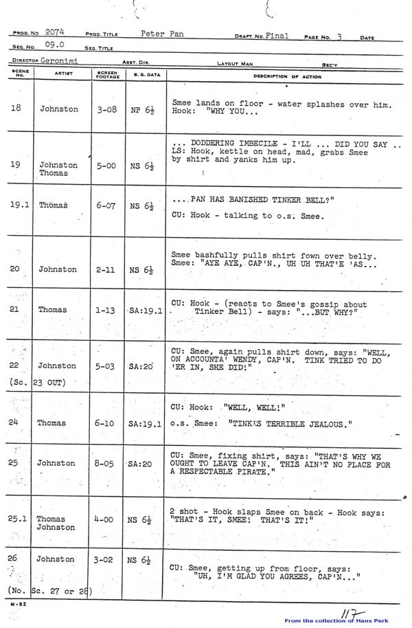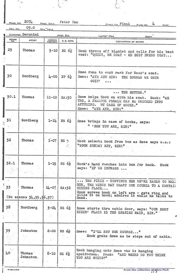 This sequence is shared by Frank and Ollie, while Nordberg has a few lesser Smee scenes. I sometimes wonder what Fred Moore would have thought about having the "role" of third fiddle to his former assistants. This draft is dated 2 months before his untimely death.