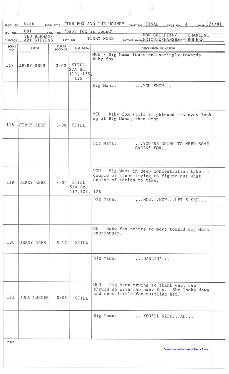 The scenes of Big Mama, and later, the other birds, meeting Tod are animated by Jerry Rees and John Musker. Between these is a short section with the other birds and Big Mama animated by Cliff Nordberg. A few close-ups of Tod are by Lorna Pomeroy(-Cook).