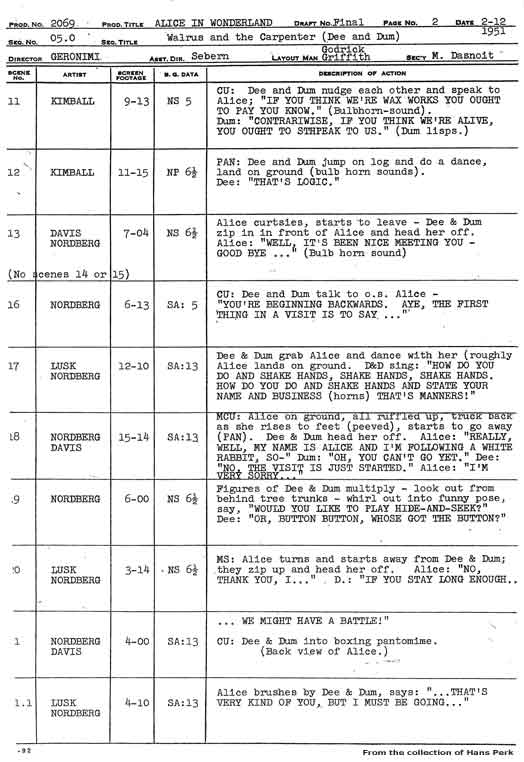 That said, above document from Al Malotte was to my knowledge the first correct description of the musical timing, as originally invented by the Disney studio for Steamboat Willie, to be found on the web. Carl Stalling took the method with him to Harman-Ising when he left Disney in January 1930, but they made the mistake of pre-recording the music track before animation was done, thus locking themselves to the pre-established beat. At Disney, the barsheets could be changed if the animation called for it. Then, when all animation was done, the musician would finalize his score.]