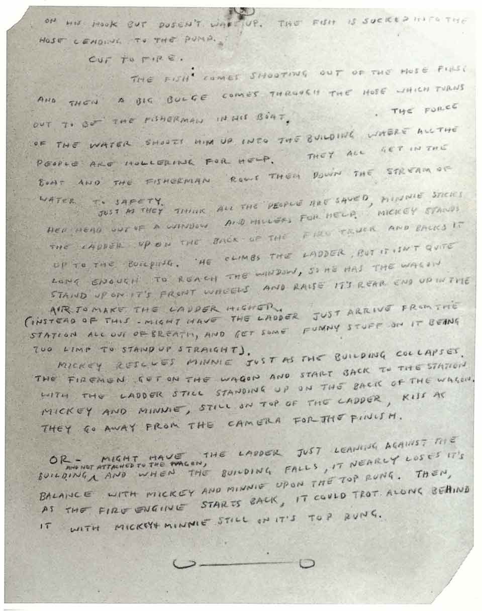 The Fire Fighters, the 1930 Mickey Mouse short. His script for this film was written and drawn on five sides of three sheets of paper. Note for instance that he had already in this stage worked out how the ladder would climb down itself!
