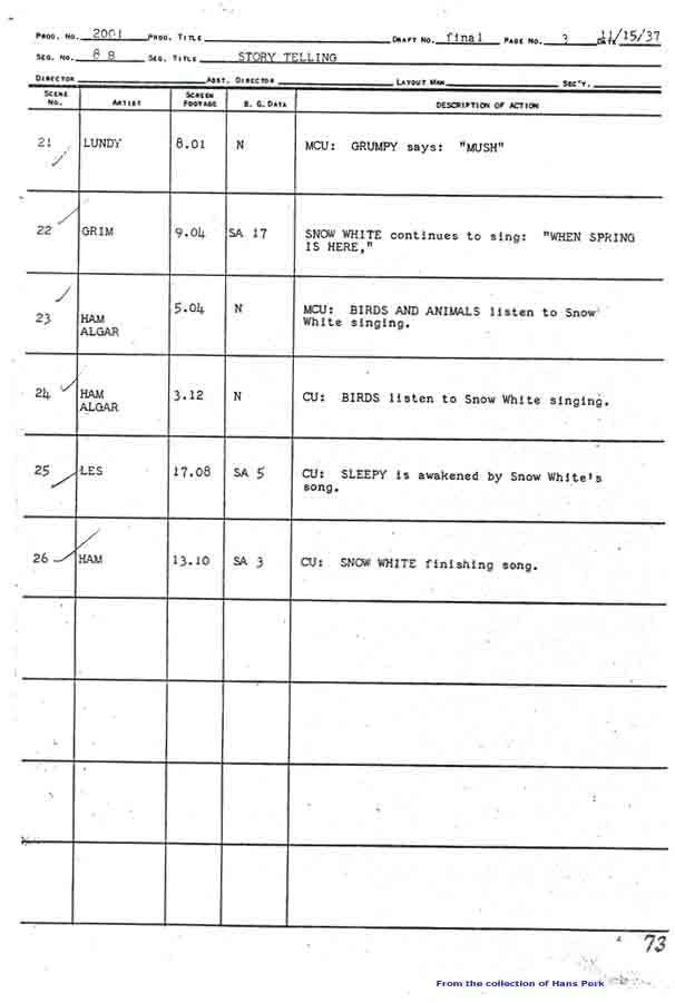 - Snow White by Ham Luske and Grim Natwick, dwarfs by Marvin Woodward, Riley [Thomson], Les Clark, Fred Spencer and Dick Lundy, effects (clock) by Cy Young.