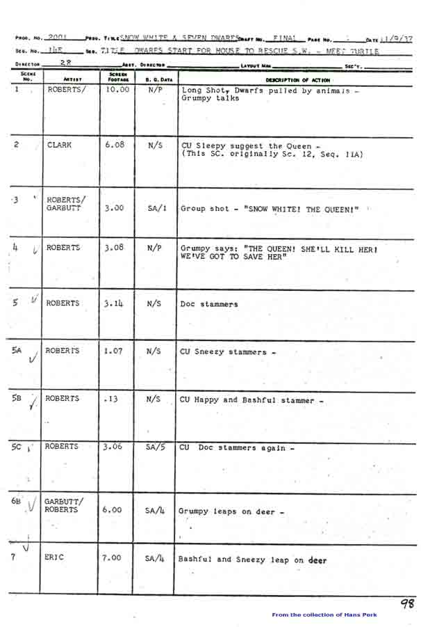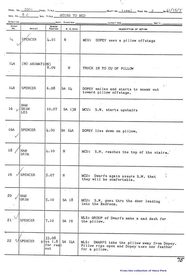 Basically we have character dwarfs by Les Clark, slapstick dwarfs by Fred Spencer and sleeping dwarfs by Marv Woodward...