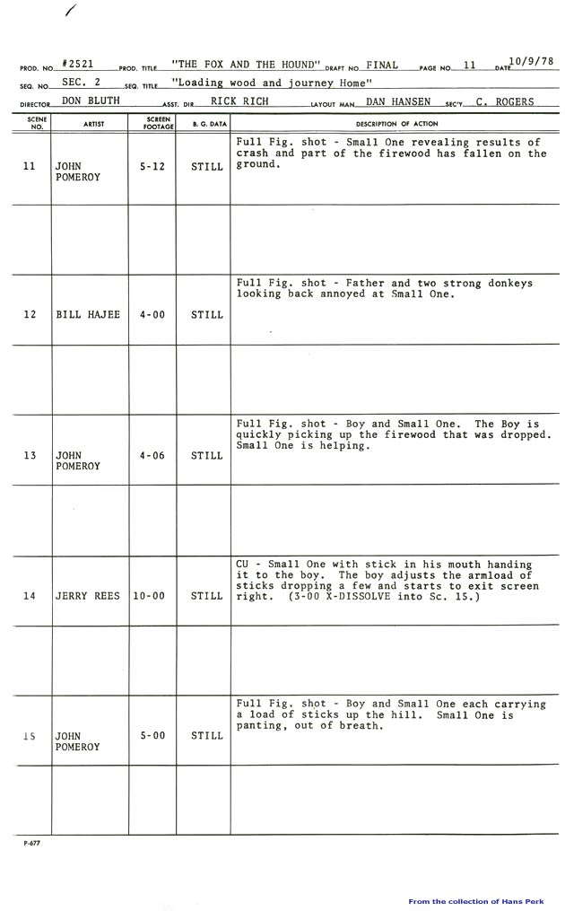 Animation by Ollie Johnston, Hal Ambro, Les Clark, Milt Kahl, Harvey Toombs, Eric Larson, Don Lusk, Hicks Lokey, Ward Kimball and Marvin Woodward. Effects by Josh Meador, Ed Aardal and George Rowley.