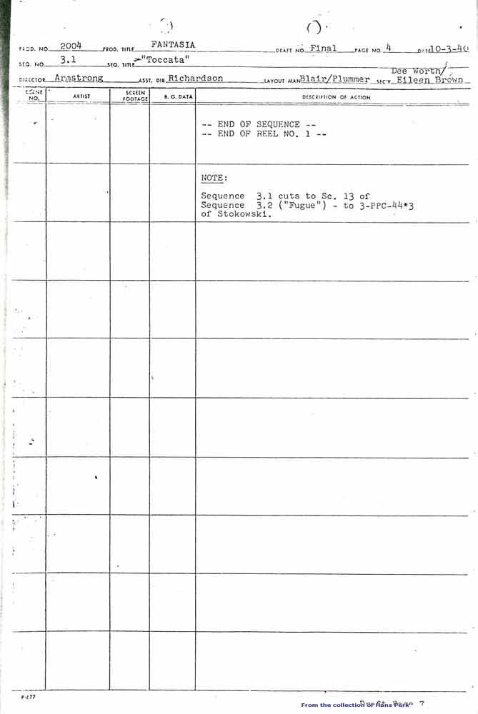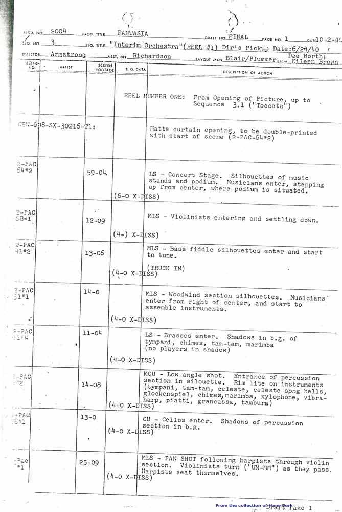 We start, of course, with the "Interim Orchestra" and the introduction of Deems Taylor in this first sequence of Fantasia, Seq. 3. (in the front of the Morgue copy, see yesterday, called Seq. 2). The Scene numbers are called 2-PAC ## - I suspect this is what we used to call "bipack." Dated 10/2/40.
