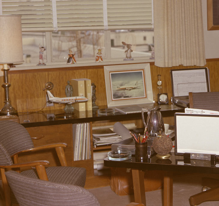 Neither the Gulfstream, nor the earlier Queen Air or King Air planes resemble the jet model, though. Looking at an image from Walt's formal office (left photo, also January 1968), I can see the plaque reads "Grumman Gulfstream 2," which to me sounds like a letter to Santa: "Dear Roy, I want one!" Then again, in Walt's working office (right photo) were both a model AND a photo of the "current" plane!