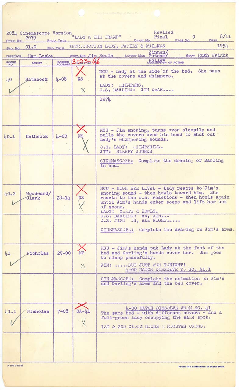 The hat box scene (Sc. 9) was animated by Les Clark, but it was left to Ken O'Brien to complete the drawings of Darling and to reposition the camera for Scope.