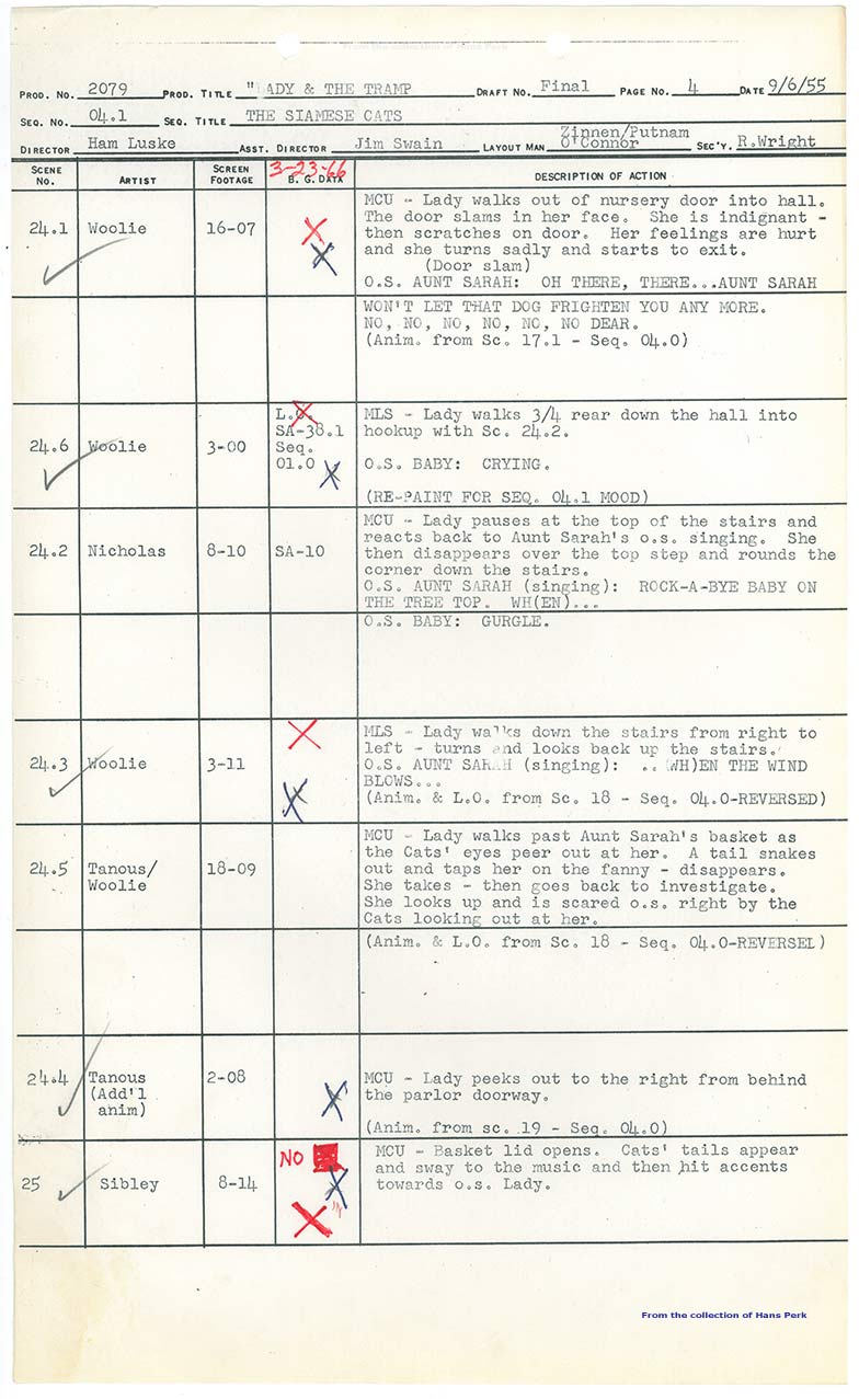 Animation by Clair Weeks doing birds to start, some effects by George Rowley. Jim, Darling and Sarah by Jack Campbell, Ken O'brien, and Bob Carlson. Lady animated by George Nicholas, Don Lusk, Henry Tanous, Woolie Reitherman, George Kreisl, and Cliff Nordberg, with one scene by Al Coe. The siamese cats, of course, by John Sibley, Bob Carlson, Bill Justice. A reaction shot of Aunt Sarah by Harvey Toombs, and pet shop scenes mostly by Hal Ambro.