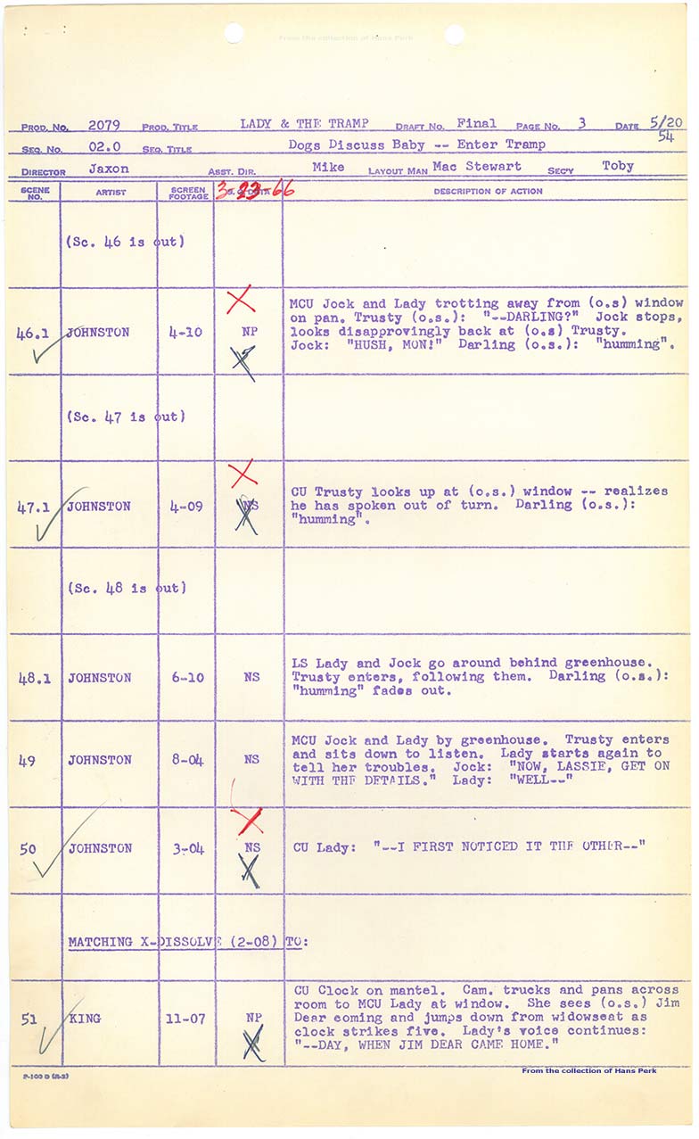 The scenes with the three dogs are mostly Ollie Johnston's work, with a few scenes (mostly of Trusty) by Milt Kahl and John Freeman. Hal King gets a few "present day" scenes before the flashbacks begin, before presumably being the supervising animator for the flashbacks. As before, Harvey Toombs and Hal Ambro animate Lady and the humans, with Hal King animating Lady on her own. It seems Toombs and Ambro were working under King's supervision?