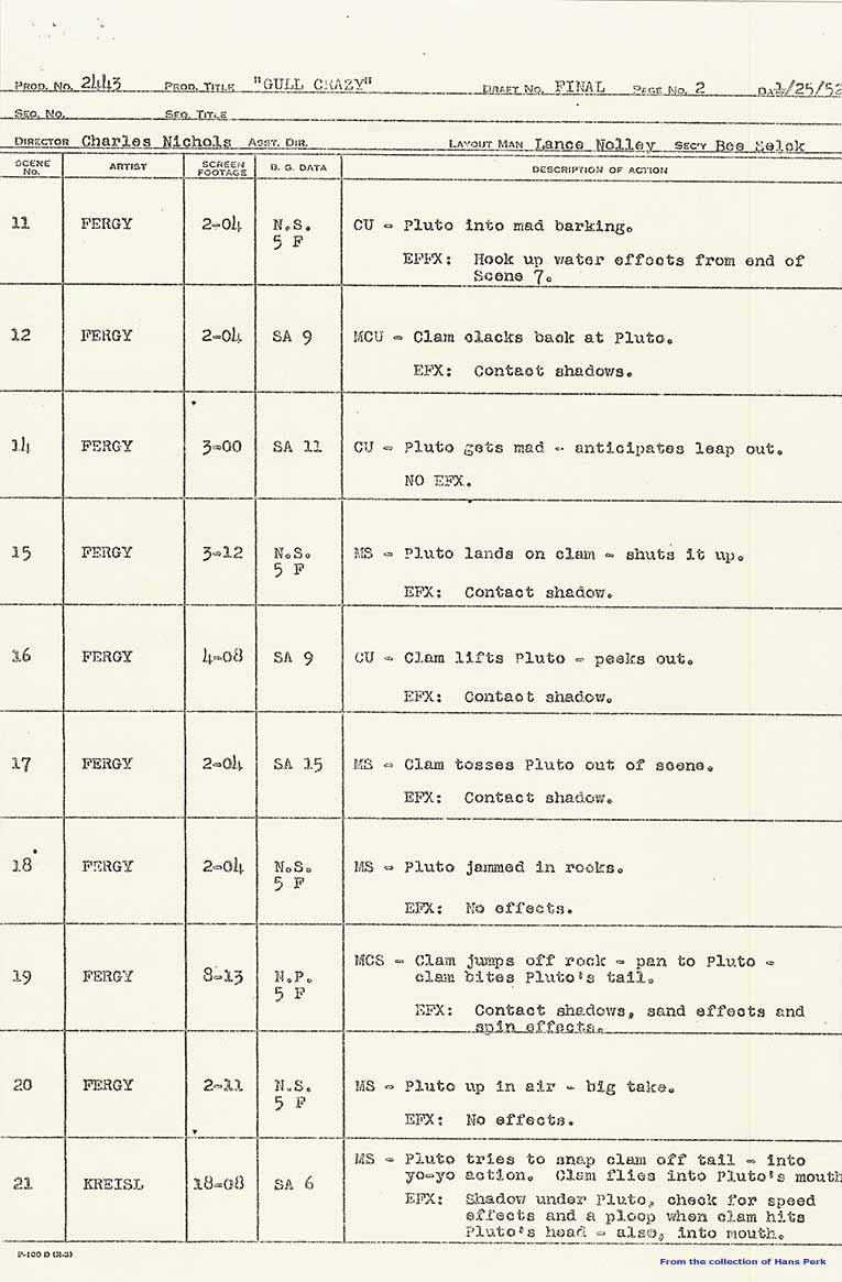 Animation by Marvin Woodward, Norm Ferguson, George Kreisl, Fred Moore, Charles Nichols (the director), George Nicholas and Dan MacManus (effects). Sadly Fred Moore died, age 41, on 11/23/52, between the date of this draft and the release date of the film.