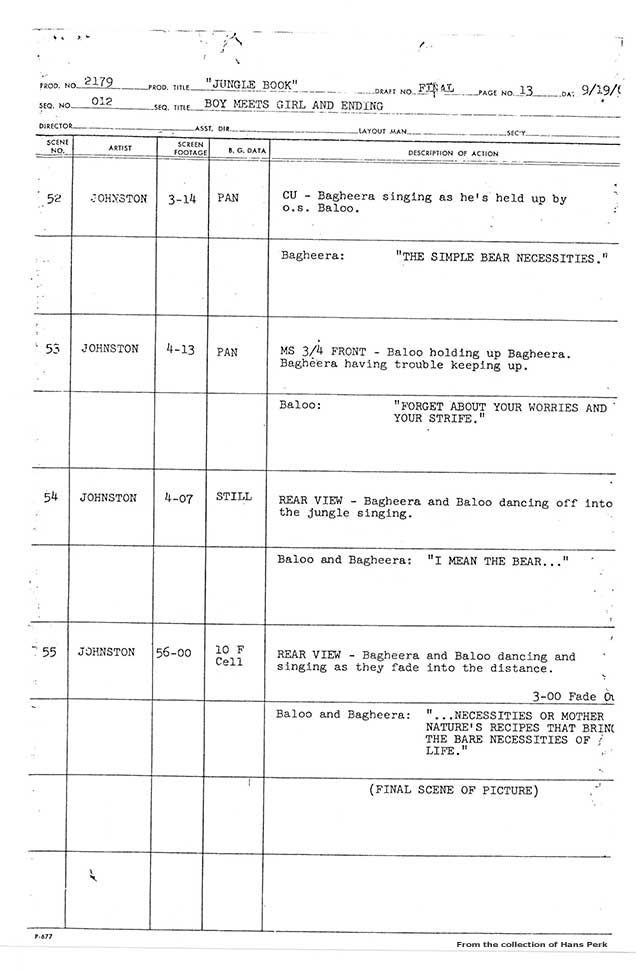 This concludes the draft of Prod. 2179, Jungle Book, the sixteenth complete draft on this blog. Remember my "standard disclaimer" which states that drafts were not prepared as historical documents, but as "go-to" documents assigning responsibility during production. As such there can be situations that the person indicated as animator was instead an assistant or other "replacement."