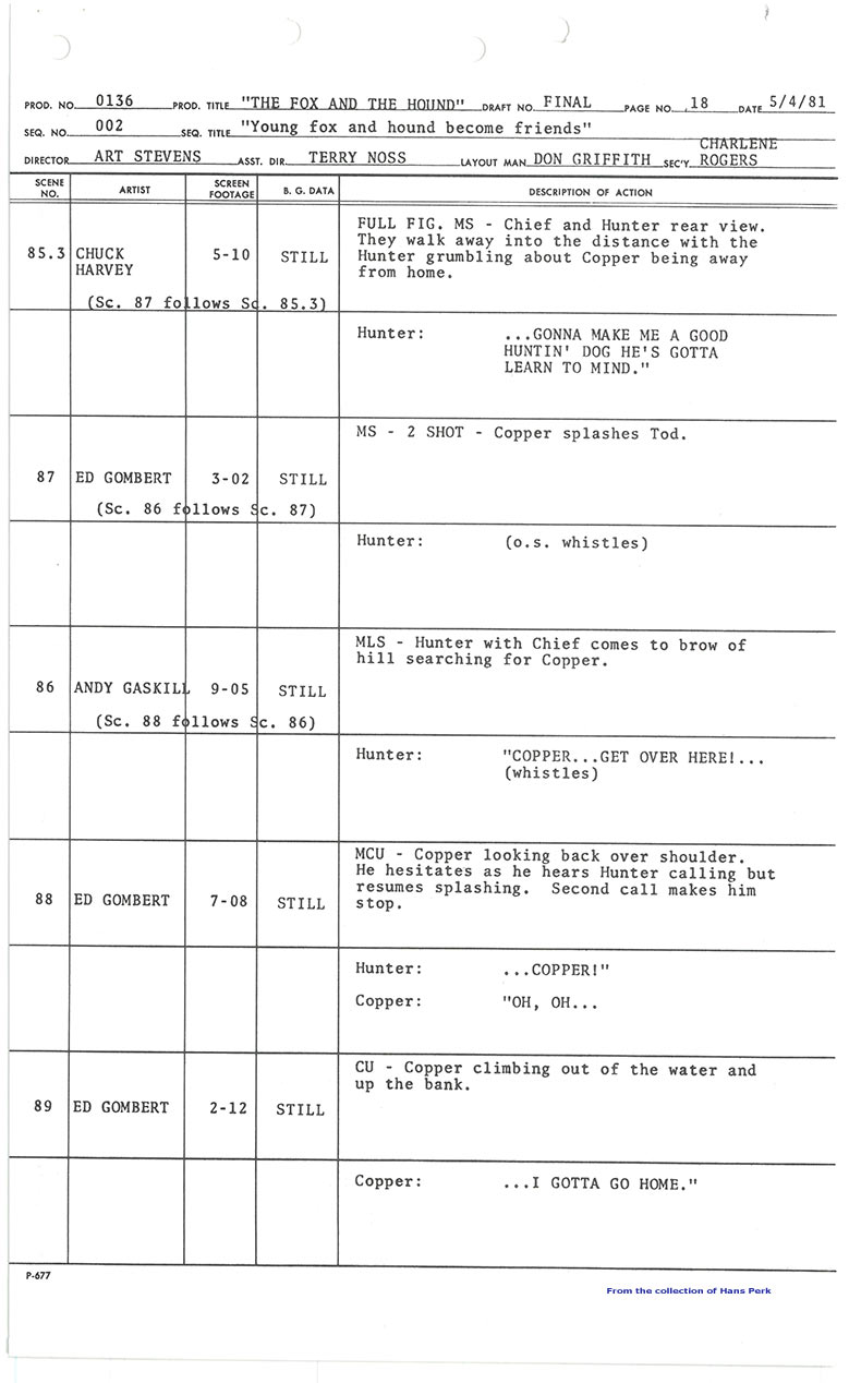 Slade and Chief searching for Copper are mostly animated by Andy Gaskill with one shot by Chuck Harvey and a close-up of Chief by "coordinating animator" Walt Stanchfield. As before, Chuck Harvey's one shot has an "additional scene" number (85.3) suggesting that he was brought on to do extra scenes late in production.