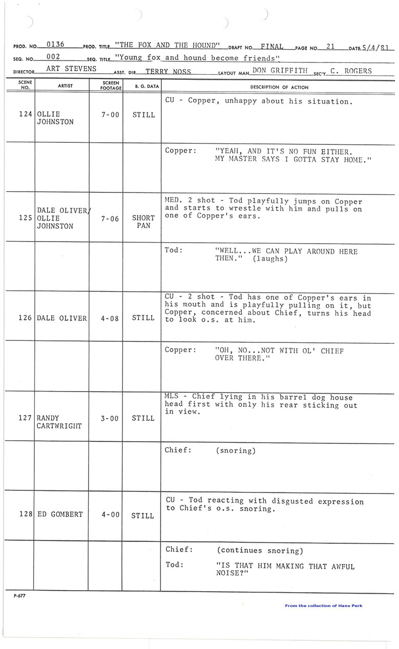 For the scenes set the following day, with Copper tied up and Tod investigating Chief, Ollie Johnston seems to be the supervising animator. Dale Oliver and Ed Gombert pick up a few shots as well... comparing this with their assignments in the earlier part of the sequence, it looks like they were part of a general "Frank-and-Ollie" team. Randy Cartwright animates Chief again, but also a few scenes of Copper, alternating with Ollie Johnston, another possible indicator that he was animating under Ollie before being promoted.