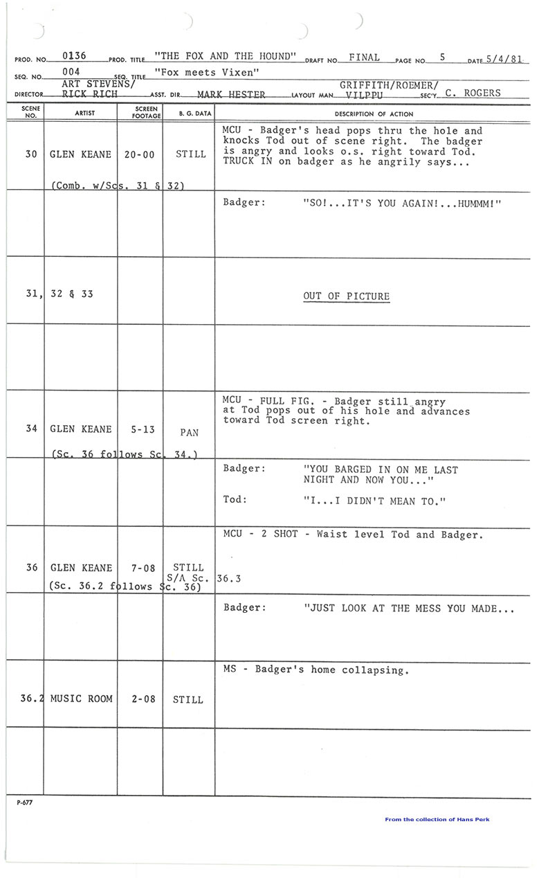 Some excellent vivacious animation from Glen, especially on all the scenes of badger, many of them featuring his signature teeth. In contrast, Glen's scenes with Vixey are a bit more subdued, like the Penny animation he did with Ollie on The Rescuers.